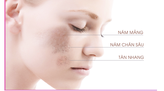 Nám da: mảng sậm màu, thường xuất hiện ở gò má, trán, cằm